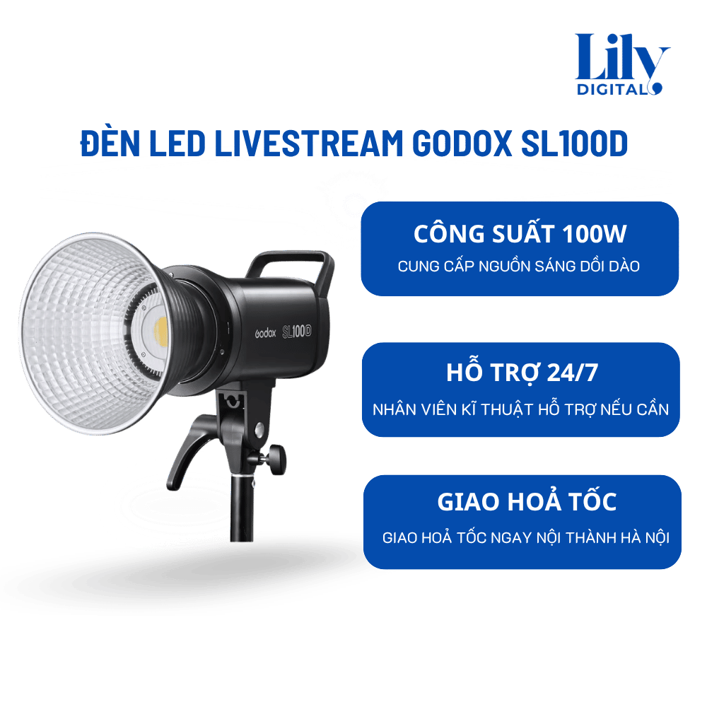 Trong các buổi livestream, quay video hay chụp ảnh, ánh sáng đóng vai trò quyết định đến chất lượng hình ảnh. Đèn LED Godox SL100D là lựa chọn lý tưởng với nguồn sáng mạnh, ổn định và dễ sử dụng, phù hợp cho cả cá nhân lẫn ekip chuyên nghiệp.